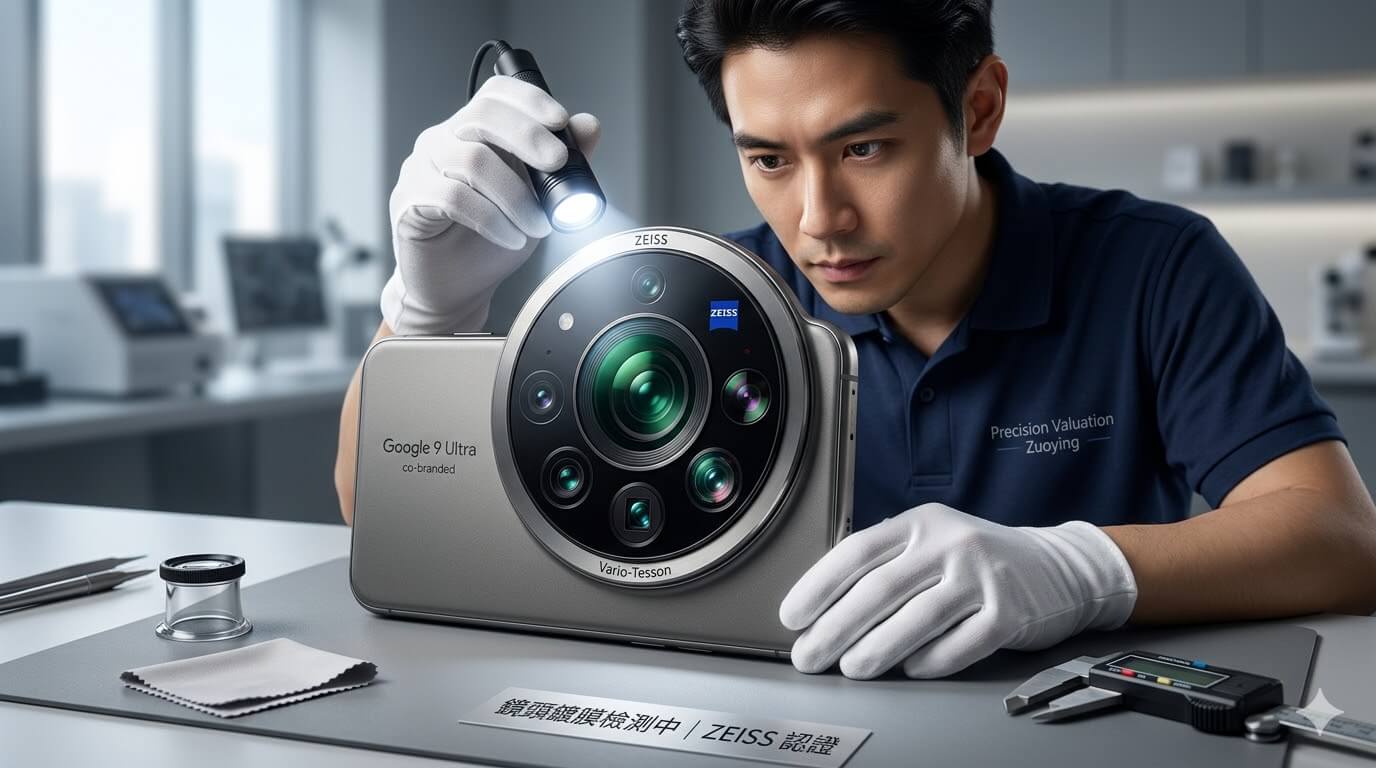 專業職人針對配備超大感光元件與聯名鏡頭的影像旗艦二手手機進行精密的光學估價檢測
